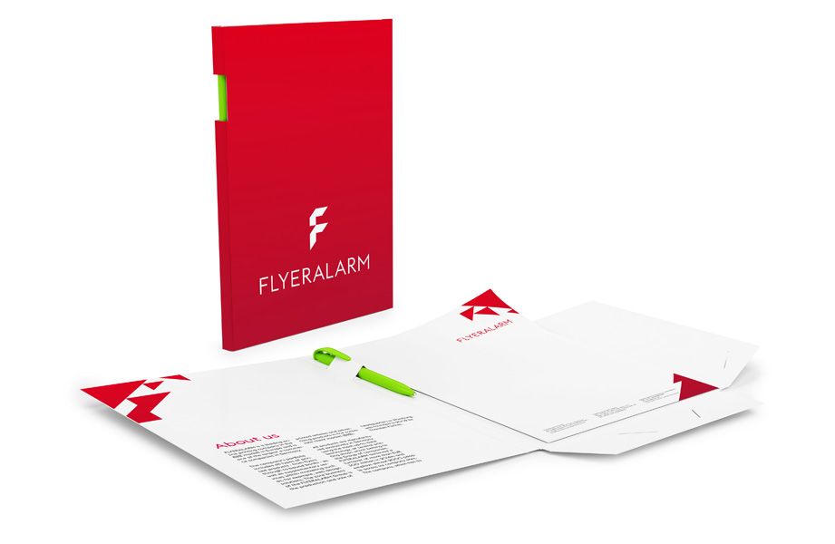 Flyeralarm va ofera posibilitatea de a alege din mai multe modele de mape de prezentare, cu un portofoliu vast care include dosare cu 2 usi cu si fara clapete, format orizontal sau vertical, dosare cu 3 usi cu clape, cu fanta de fixare sau realizate din plastic transparent, cu inchidere elastica.